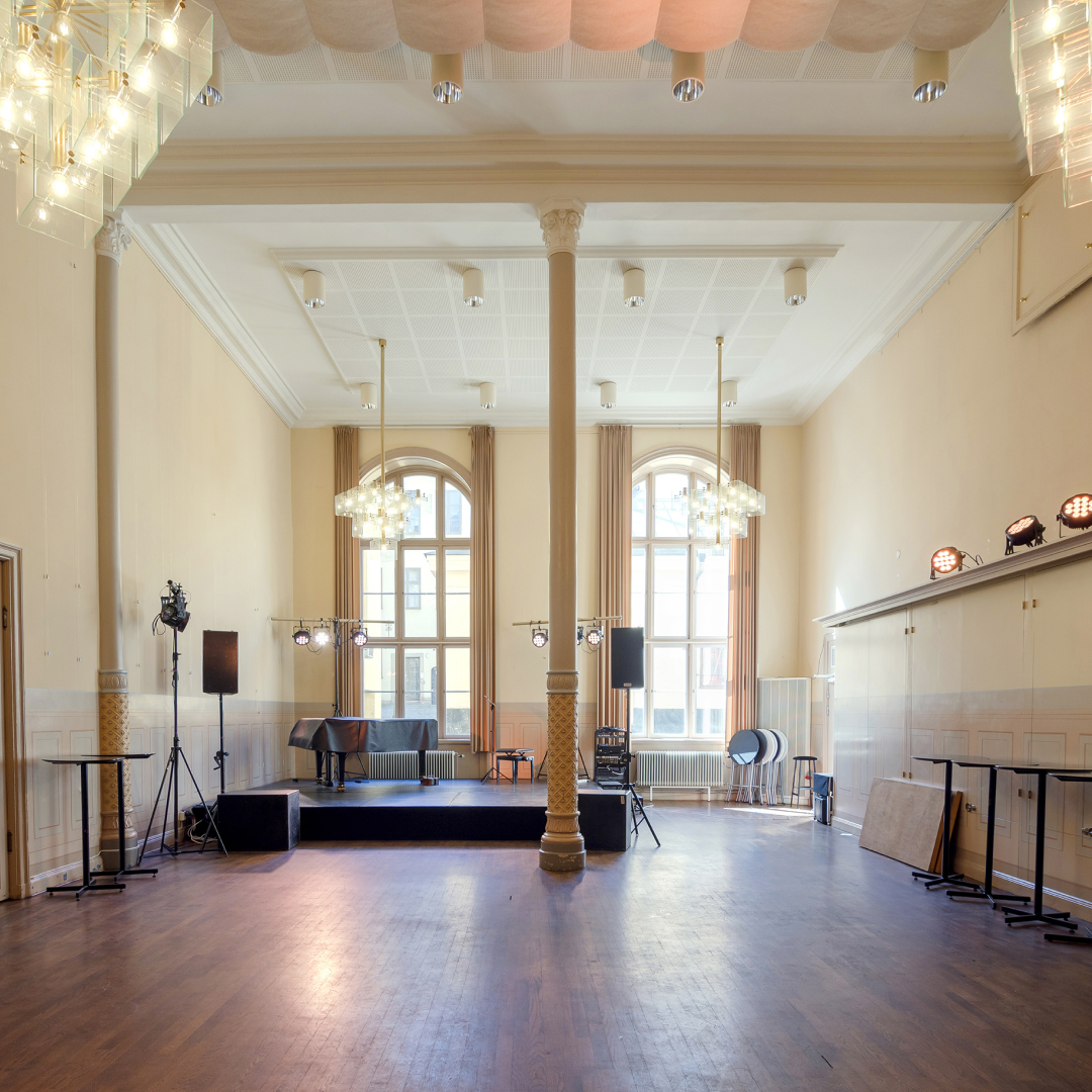 Detta magnifika rum på 122 kvadratmeter och 7 meter i takhöjd är perfekt för mindre konserter, möten och fest. Här finns flygel, ljud- och ljusteknik, projektor och duk.